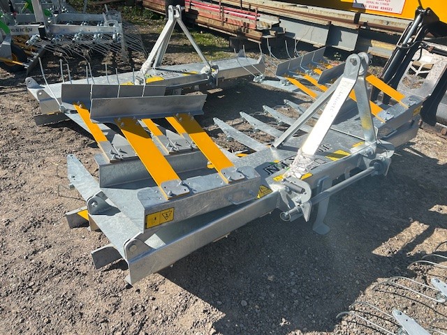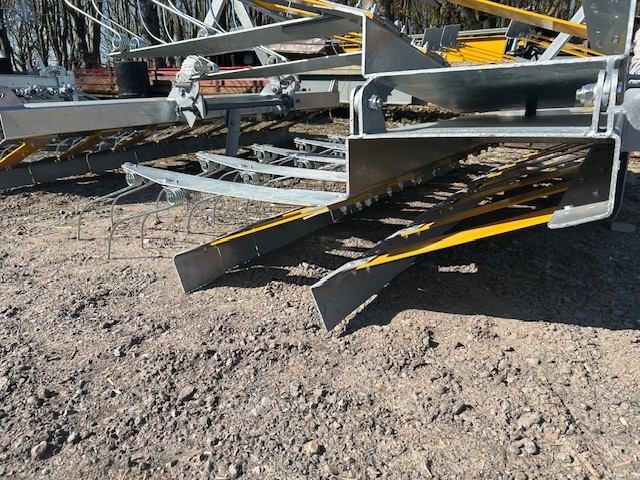 galvanised grassland harrow, manual folding, 2.4m transport width, CAT II linakge, quick release lower link bar, two rows of paddle boards, two rows of double spring tines